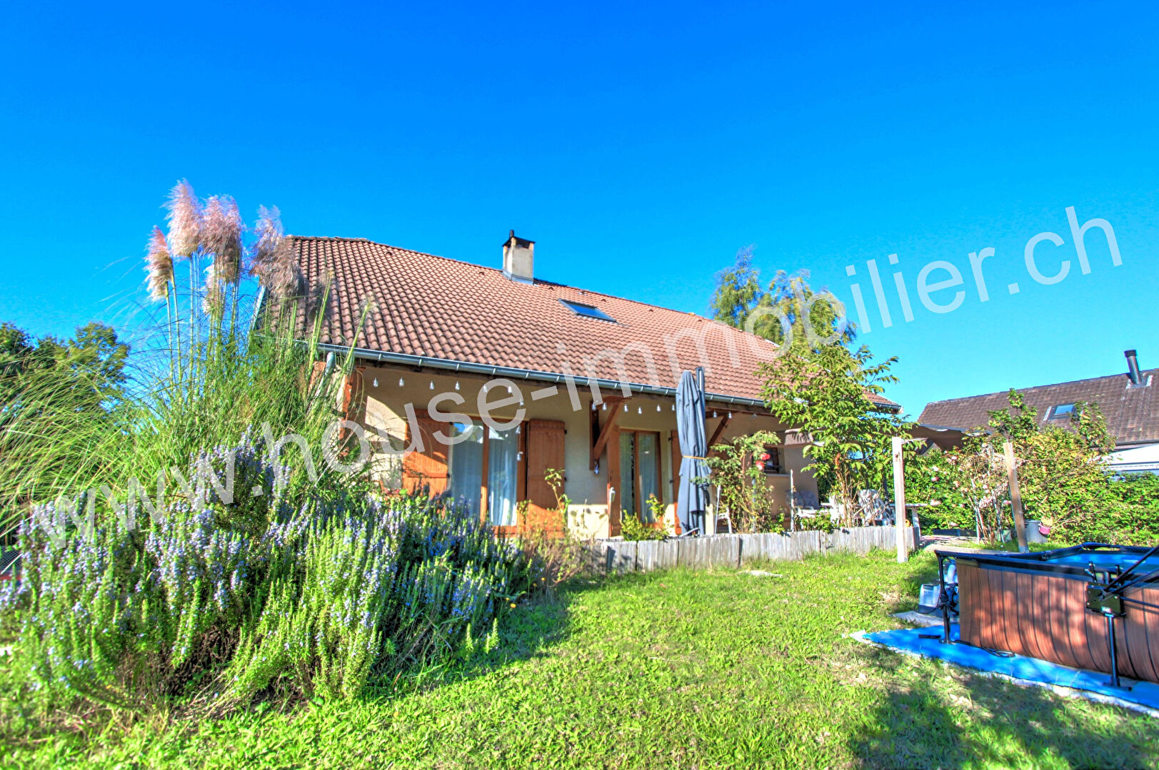 Le terrain de 899 m² est entièrement clos et paysagé, avec piscine chauffée par pompe à chaleur et garage de 24 m² avec mezzanine.