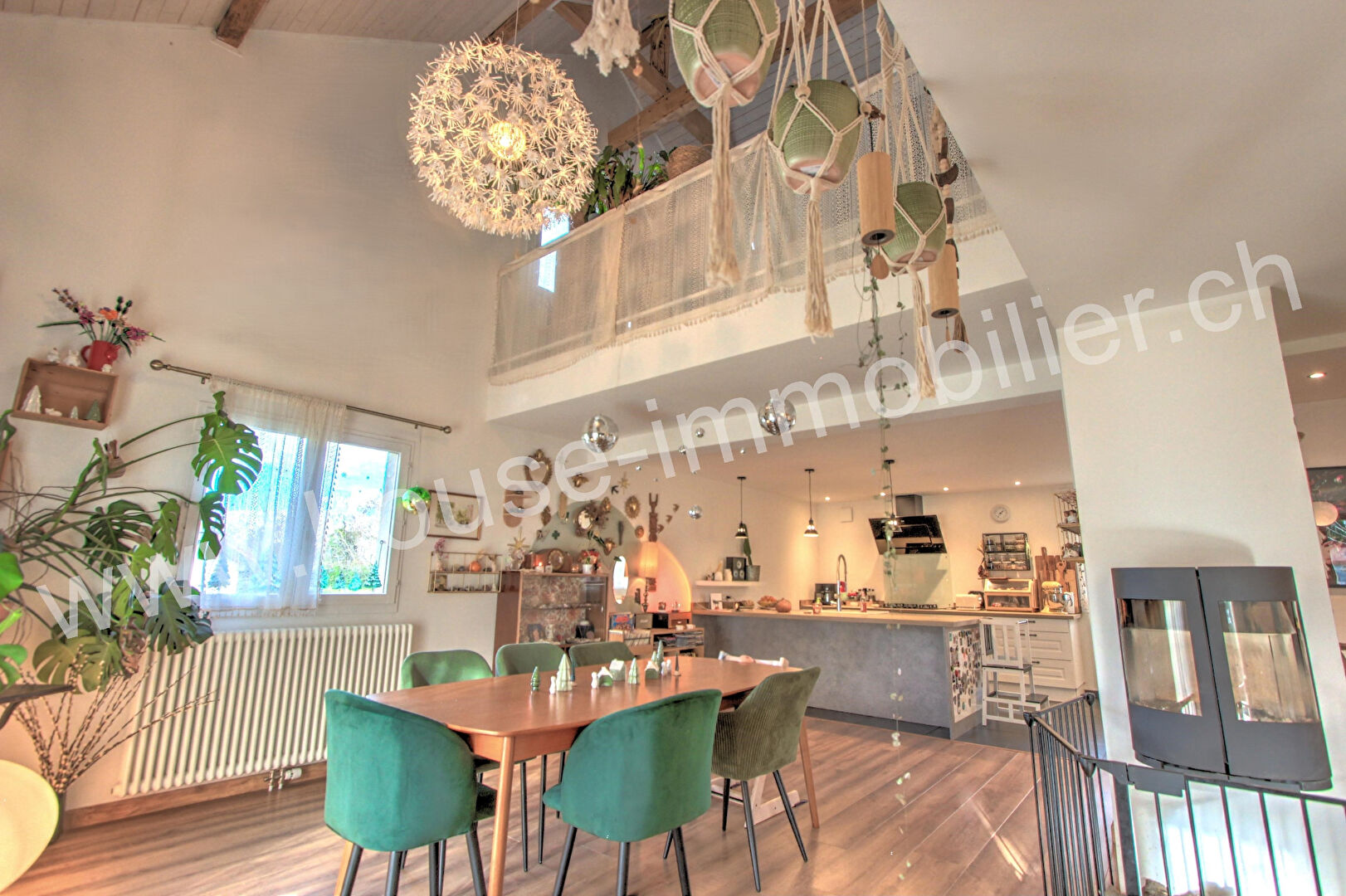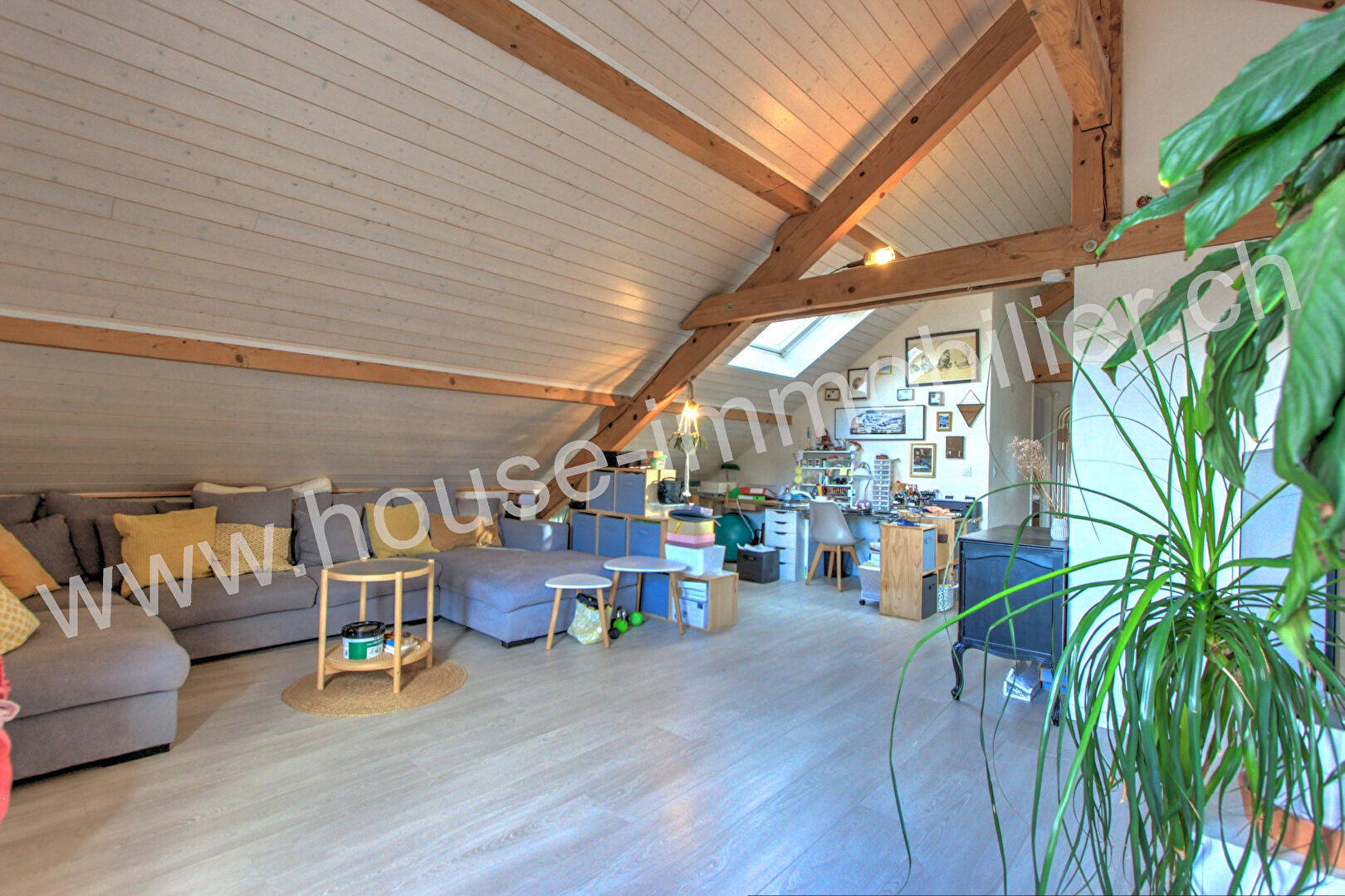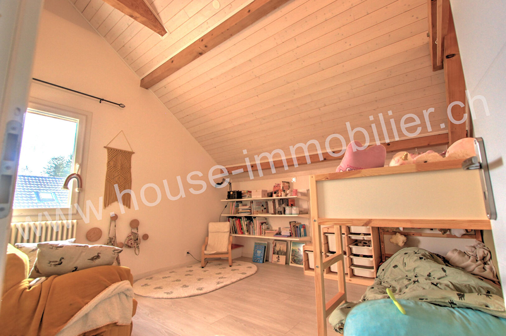 A l’étage : mezzanine de 23 m² (actuellement salle de jeux), deux chambres, salle d’eau avec WC.